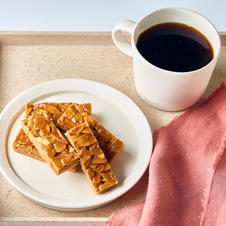ひと口食べれば、キャラメルの甘さとアーモンドの香ばしさが口いっぱいに広がり、その繊細でリッチな風味が楽しめます。「フロランタン」と合わせるなら、ナッツのような香ばしさと濃厚なコクと甘みのあるブラジルを主体にコロンビアがブレンドされたバランスの良い味わいのコーヒーがおすすめ。