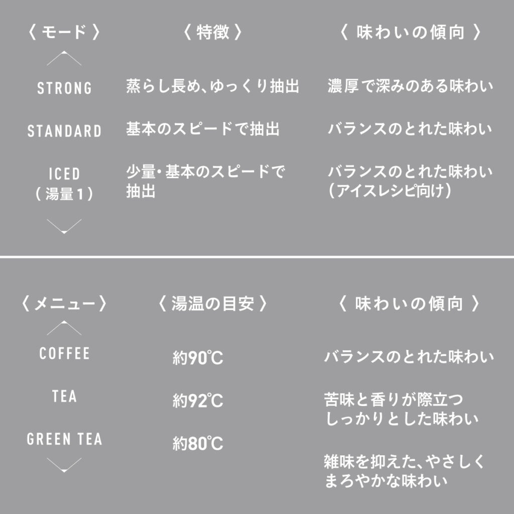 ドリップポッドのマシン操作だけでも、抽出スピードや湯温を調整できることはご存じでしたか?「COFFEE」や「TEA」などの抽出メニュー、「STRONG」などの抽出モード、湯量を掛け合わせることで同じカプセルでもいつもと違う味わいが楽しめますよ。