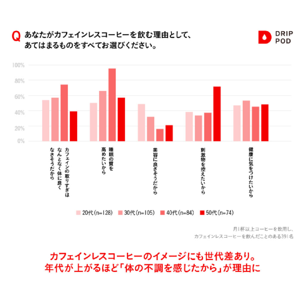 一方で、30〜50代の層では、「睡眠の質を高めたい」「健康維持のために」といった回答が多く、健康や休息を意識したセルフケアのひとつとして、カフェインレスコーヒーへの関心が高まっているのではないでしょうか。