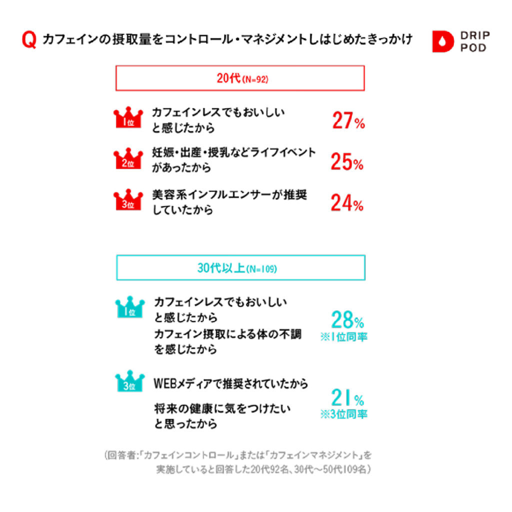 これまで“味が物足りない”というイメージを持っていた人も、実際に飲んで“おいしい”と感じたことが、カフェインレスを続けるきっかけになることもあるかもしれません。こうしたおいしさへの満足感が、若い世代を中心にカフェインレスの広がりを後押ししていると推察します。