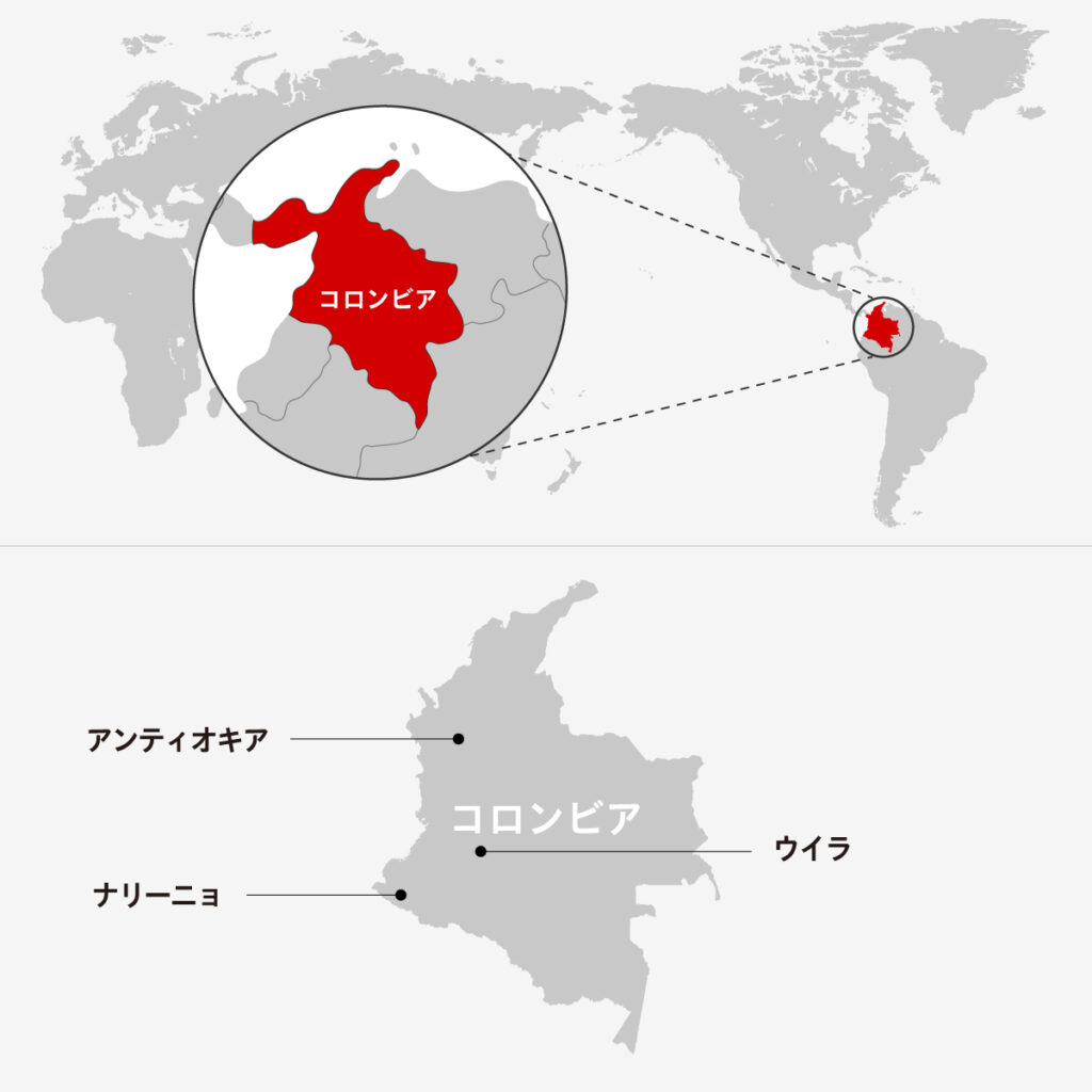 アンデスの山脈が三方向に走り、火山性の肥沃な土壌と多彩なマイクロクライメイトが交差するコロンビア。標高1,200〜2,000mの高地に広がるコーヒー畑では、昼夜の寒暖差が果実をゆっくり熟させ、甘み・酸味・香りのバランスに優れた味わいが生まれます。