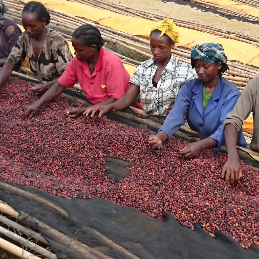 また、エチオピアのコーヒーは主に小規模農家によって栽培されています。自然と共生した伝統的な農法が守られ、多くの農家が家族経営で栽培・収穫を行い、手作業で選別を行うことにより、高品質なコーヒーが生産されています。精製方法にも特徴があります。代表的なのが「ナチュラル(非水洗式)」と「ウォッシュド(水洗式)」です。ナチュラル製法では果実をつけたまま乾燥させることで、甘みやベリー系のフルーティーな風味が強調されます。一方、ウォッシュド製法では豆のクリーンな酸味と明るいフレーバーが際立ちます。