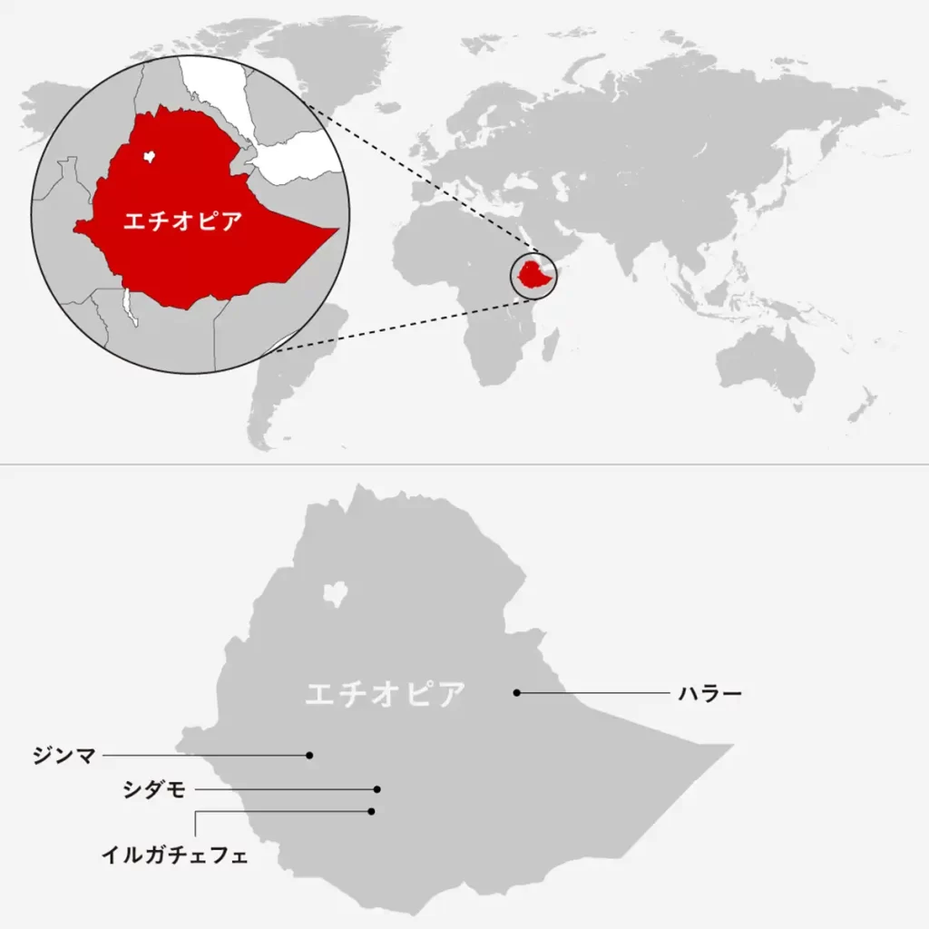 「コーヒーの発祥地」として知られるエチオピアは、世界第5 位のコーヒー生産量を誇る有数の産地です。古くから受け継がれる在来品種と伝統的な農法が、個性豊かなの味わいを生み出し、世界中のコーヒー愛好家から高く評価されています。